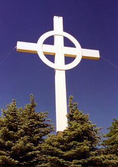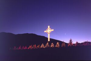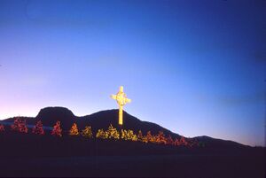 In 1995 a large white cross with a circle at the nexus of the two bars was positioned outside King Arthur’s Court overlooking the Yellowstone River. Lit from below at night, the cross could be seen from the highway and surrounding area.