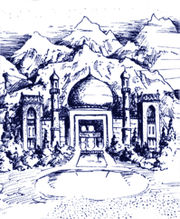 The etheric retreat is a glistening white building in Moorish architecture, square with minarets at the four corners and a large central flame-shaped dome. The walls are as thick as a medieval castle. The apertures are also flame or dome-shaped, delicately shaded in a pale blue as are the doorways, the apertures atop the minarets, and the carvings that mark the divisions of the four stories of the retreat. | The etheric retreat is a glistening white building in Moorish architecture, square with minarets at the four corners and a large central flame-shaped dome. The walls are as thick as a medieval castle. The apertures are also flame or dome-shaped, delicately shaded in a pale blue as are the doorways, the apertures atop the minarets, and the carvings that mark the divisions of the four stories of the retreat. | ||